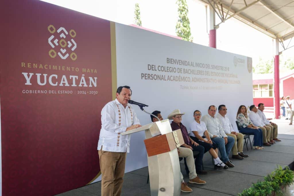 Al dar la bienvenida a las alumnas, alumnos, así como al personal académico, administrativo y manual del plantel tizimileño, donde fue maestro hace 30 años, el mandatario estatal reiteró su compromiso de trabajar para que, en Yucatán, los jóvenes tengan oportunidades de estudiar en condiciones dignas.