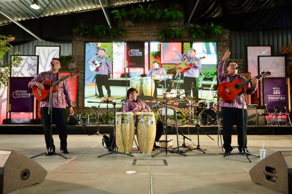 El foro cultural del Palacio de los Deportes ha vibrado con presentaciones de grandes voces de la escena yucateca, trova, comedia regional y la música de agrupaciones como la Orquesta Típica Yukalpetén, que llenan de orgullo y color cada jornada.