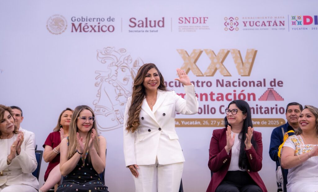 La acompañaron en el presídium la jefa de la Unidad de Atención a Población Vulnerable del Sistema Nacional para el Desarrollo Integral de las Familias (Sndif), Mariana Perla Rojas Martínez; la directora general de Alimentación y Desarrollo Comunitario, Uritzimar San Martín López; y la directora general del DIF Yucatán, Shirley Edith Castillo Sánchez, así como titulares de los DIF estatales del país.