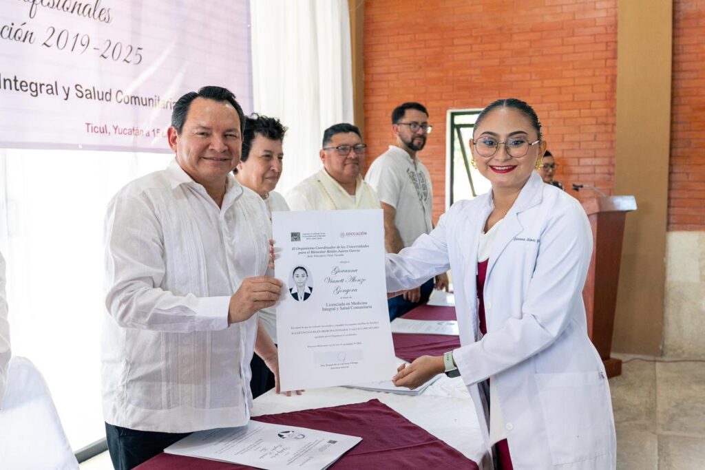 El Gobernador Joaquín Díaz Mena entregó 62 títulos profesionales a la primera generación de egresadas y egresados de la Universidad para el Bienestar Benito Juárez García (Ubbjg), en la carrera de Medicina Integral y Salud Comunitaria, programa creado para acercar educación superior gratuita a zonas vulnerables de Yucatán.