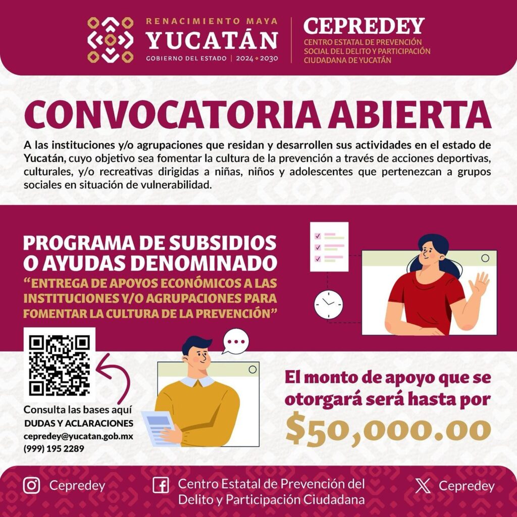El Gobierno del Estado, a través del Centro Estatal de Prevención Social del Delito y Participación Ciudadana (Cepredey), emitió la Convocatoria 2025 del programa de subsidios “Entrega de apoyos económicos a instituciones y/o agrupaciones para fomentar la cultura de la prevención”, dirigido a colectivos y organizaciones que promuevan la paz, la inclusión y la seguridad mediante acciones deportivas, culturales o recreativas enfocadas en niñas, niños y adolescentes en situación de vulnerabilidad.