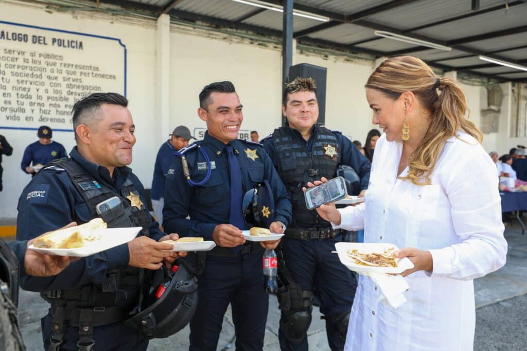 Al concluir el desfile conmemorativo, Cecilia Patrón visitó las instalaciones de la Policía Municipal de Mérida para felicitar a los elementos policiales por su destacada participación durante el desarrollo de estas actividades.