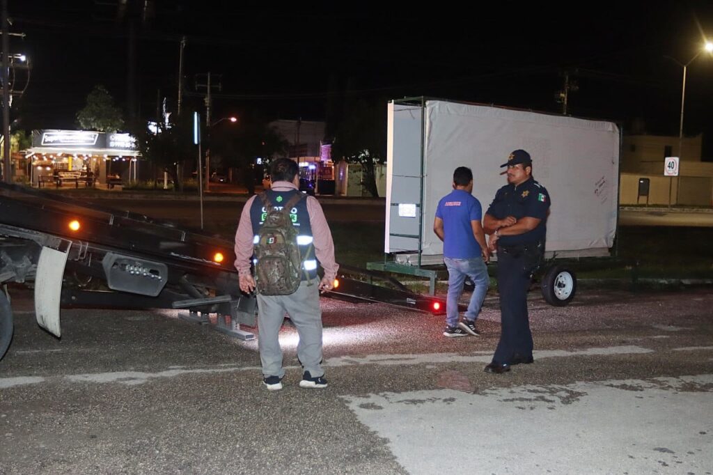 En un segundo operativo efectuado sobre la Avenida 24 del Fraccionamiento Santa Gertrudis Copó, a la altura de la plaza comercial “La Isla”, fueron retiradas dos unidades móviles de venta de alimentos tipo “foodtruck”, dedicadas a la venta de tortas y tacos. Ninguna de las unidades contaba con permiso de operación ni placas de identificación, situación que representaba un riesgo tanto para los transeúntes como para los propios consumidores.