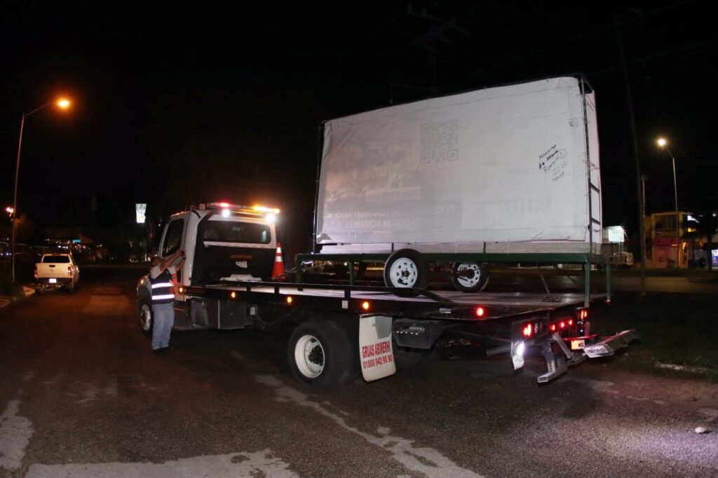 El primer dispositivo se realizó en la calle 7 del Fraccionamiento Paraíso Maya, donde el personal municipal retiró vallas publicitarias que operaba sin autorización, así como dos camionetas abandonadas —una Dodge Voyager y una Dodge Ram 400— que, de acuerdo con reportes vecinales, generaban condiciones insalubres, inseguridad y lapresencia de fauna nociva.