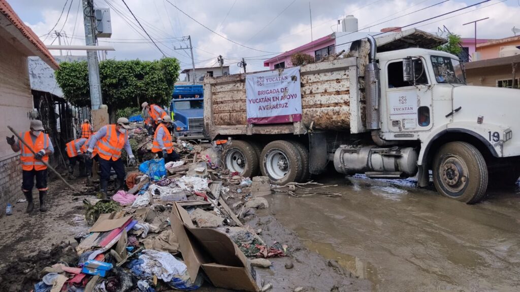 Hasta los puntos más apartados de esta región veracruzana han llegado las y los brigadistas yucatecos, acompañados de maquinaria pesada y equipo especializado enviado por el Gobierno del Renacimiento Maya que encabeza el Gobernador Joaquín Díaz Mena con el propósito de contribuir a las labores de limpieza, desazolve y recuperación de la infraestructura urbana y social dañada.