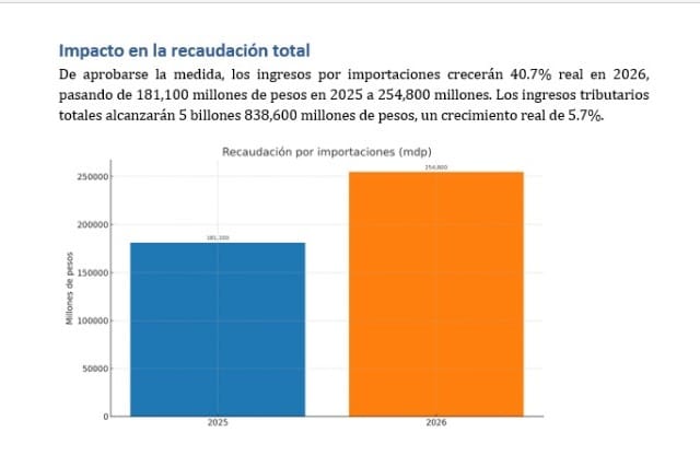 De ser aprobada esta medida, la dependencia estima que la recaudación por concepto de importaciones crecerá en 40.7% real durante 2026, pasando de 181,100 millones de pesos en 2025 a 254,800 millones de pesos.