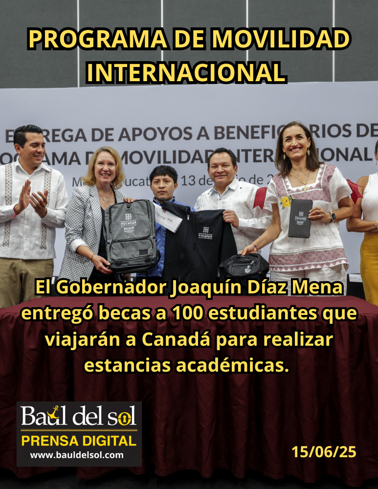 Con una inversión superior a 10.5 millones de pesos, el Gobernador Joaquín Díaz Mena encabezó la entrega de apoyos integrales a cien estudiantes yucatecos que viajarán a Canadá para participar en el programa de Movilidad Internacional 2025, el cual busca potenciar sus habilidades académicas, culturales y sociales en un entorno global.