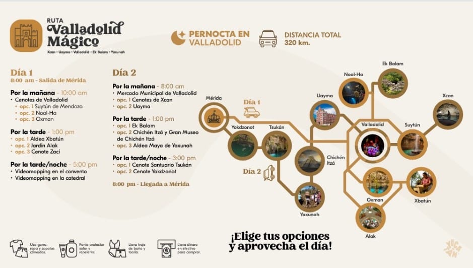 Cada recorrido está diseñado con propuestas de actividades, opciones gastronómicas y alternativas de hospedaje, destacando la riqueza natural, arqueológica y cultural de cada región Los detalles están disponibles en el micrositio https://yucatan.travel/conociendo-yucatan.