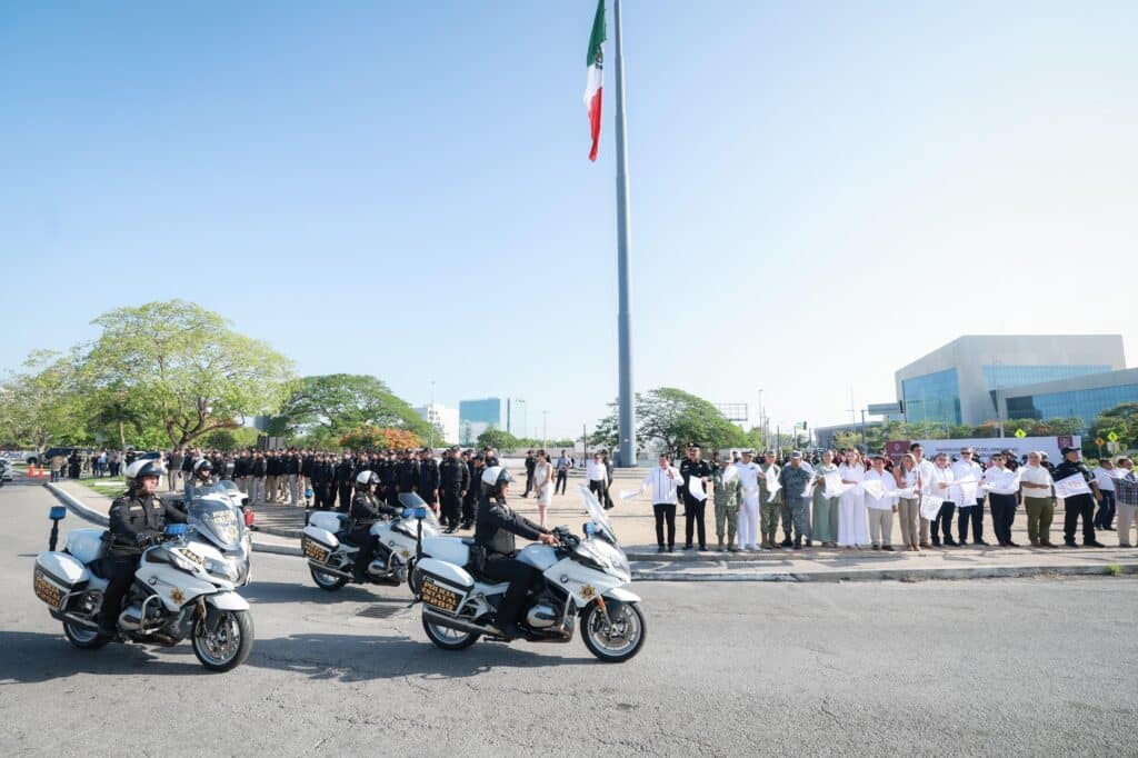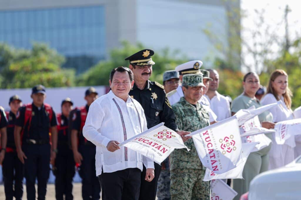 Desde el asta bandera monumental, al norte de Mérida, el Gobernador Joaquín Díaz Mena dio el banderazo de salida al contingente conformado por elementos de la Secretaría de Seguridad Pública (SSP), policías municipales, Ejército Mexicano, Secretaría de Marina, Guardia Nacional, las Fiscalías General de la República y del Estado, así como personal de Protección Civil.