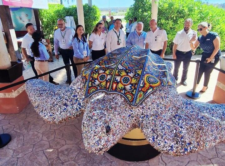 La Terminal Internacional de Cruceros de Progreso exhibe desde esta semana “Tortuga: arte en el agua”, una escultura monumental del maestro César Menchaca elaborada con plástico recolectado del mar e intervenida con chaquira de cristal bajo la técnica del arte wixárika.