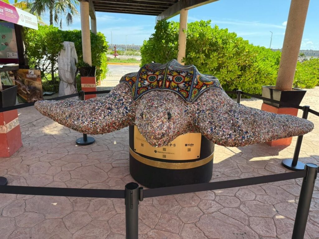 Con 130 kilos de peso, la pieza de César Menchaca busca sensibilizar a turistas sobre la protección de los océanos y mostrar la riqueza cultural de México.