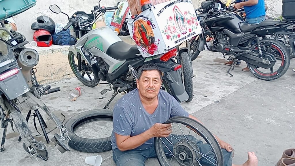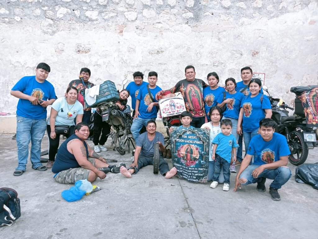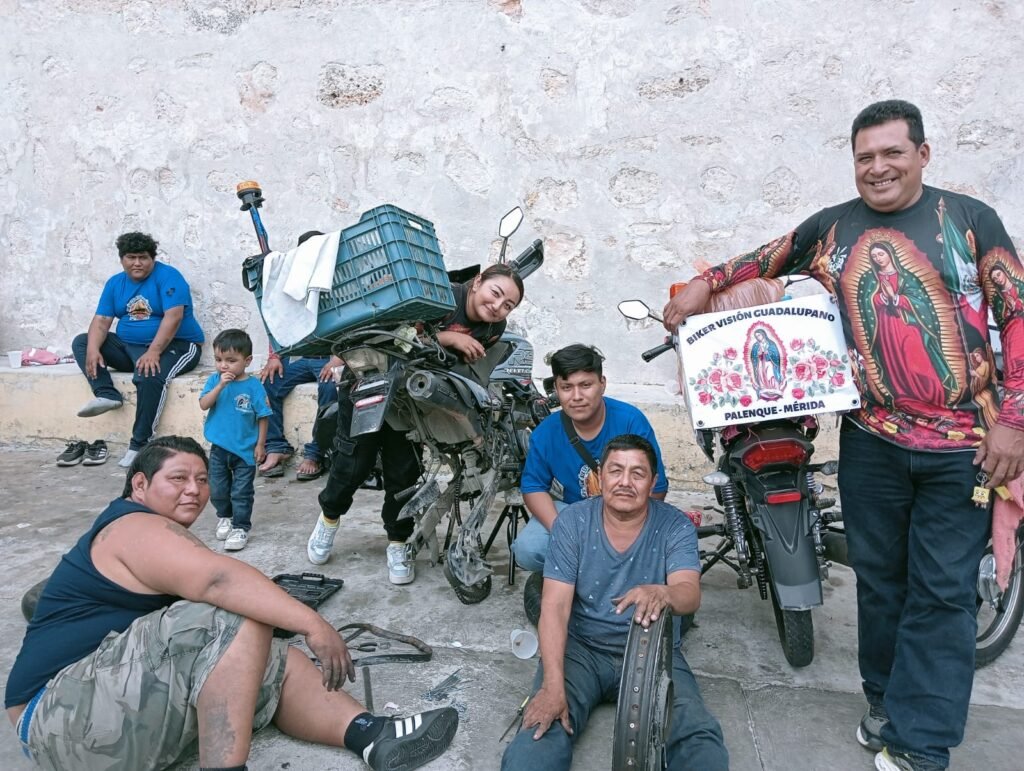 En el costado norte del santuario, otro grupo de peregrinos se acomoda para pasar la noche. Son 18 motociclistas provenientes de Palenque, Chiapas, quienes viajaron hasta Campeche y después a Mérida para cumplir con su promesa anual. Entre ellos está don Isaías Pérez González, dueño de un taller mecánico, quien viaja acompañado por su esposa, hijas, yernos y nietos. Mientras repara la rueda de su motocicleta, cuenta que este es el cuarto año que realizan el recorrido familiar. “El año pasado fuimos a la Basílica; hoy venimos a Mérida. Es nuestra manera de agradecer y de pedir fortaleza”, asegura.