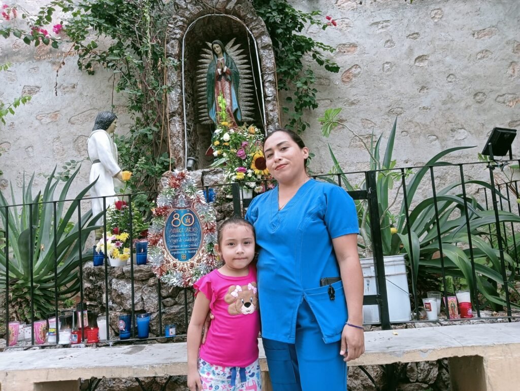 Dentro del santuario, los rezos se escuchan de manera ininterrumpida. Muchas madres aprovechan estos días con menor afluencia para llevar a sus hijos ante la Morenita del Tepeyac. Entre ellas está Berenice Calderón, quien sonríe mientras toma una fotografía de su pequeña Allison frente al altar adornado con flores.