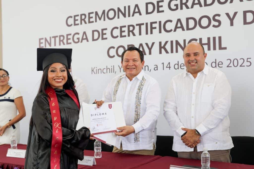 Durante el evento, en el que se entregaron certificados y diplomas a 95 jóvenes egresados, el mandatario estatal recordó que esta beca estatal está dirigida a estudiantes que no resultaron beneficiados por la convocatoria federal, por lo que su administración implementó este apoyo adicional, que se entregará mediante la tarjeta Felipe Carrillo Puerto.