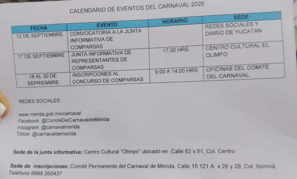 Para comparsas, el 17 de septiembre hay una junta informativa de representantes a las 17:00 horas, en el Centro Cultural Olimpo. Del 18 al 30 de septiembre serán las inscripciones al concurso, de 9 a 14 horas en las Oficinas del Comité del Carnaval.