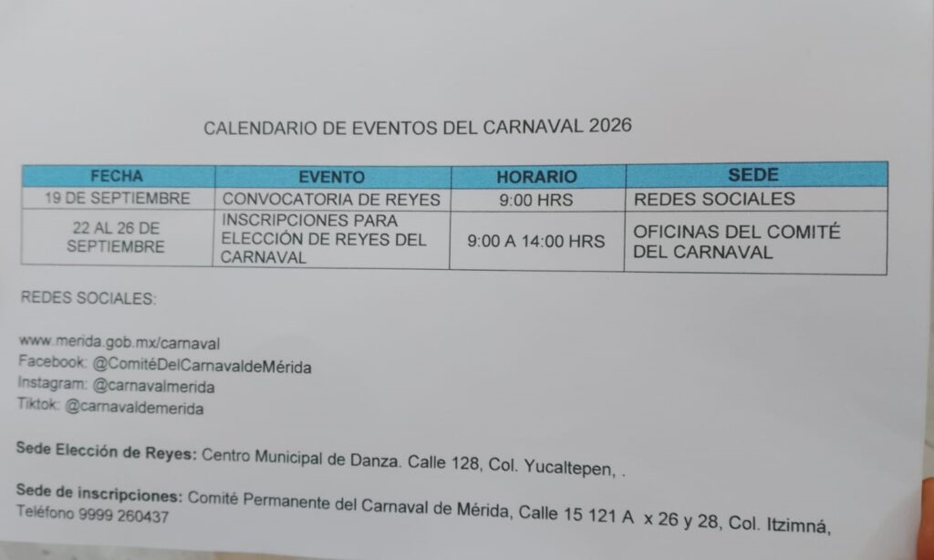 La Secretaría Ejecutiva del Comité Permanente del Carnaval de Mérida, Mariana Villamil Rodríguez, informó que arrancan los preparativos para el Carnaval de Mérida 2026 con el lanzamiento de las convocatorias para selección de reyes y comparsas.