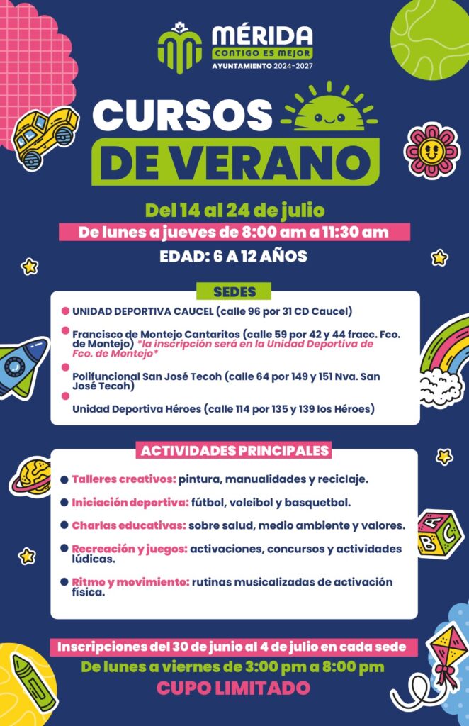 Con una amplia variedad de actividades, diseñadas para fomentar la creatividad, la imaginación y el trabajo en equipo, el Ayuntamiento de Mérida realizará los “Cursos de Verano Mérida 2025” y “Verano Aventuras”, iniciativas para promover la recreación, el aprendizaje y el desarrollo de habilidades de niñas y niños de 6 a 12 años en un ambiente divertido y seguro.