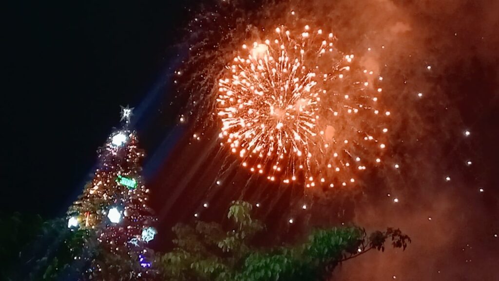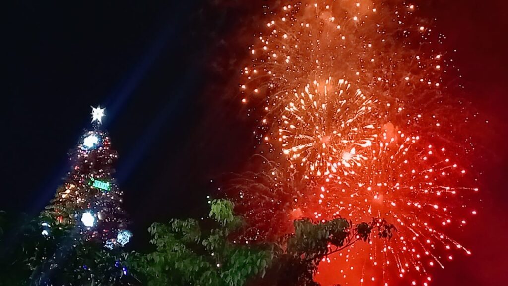 Antes de iniciar el tradicional show navideño, el público quedó gratamente asombrado con los juegos artificiales que iluminaron el cielo, momentos en los que prácticamente no cabía ni un alfiler en el lugar, y una muestra de esto fueron las largas filas de vehículos que infructuosamente buscaban un lugar cercano al árbol para estacionarse.