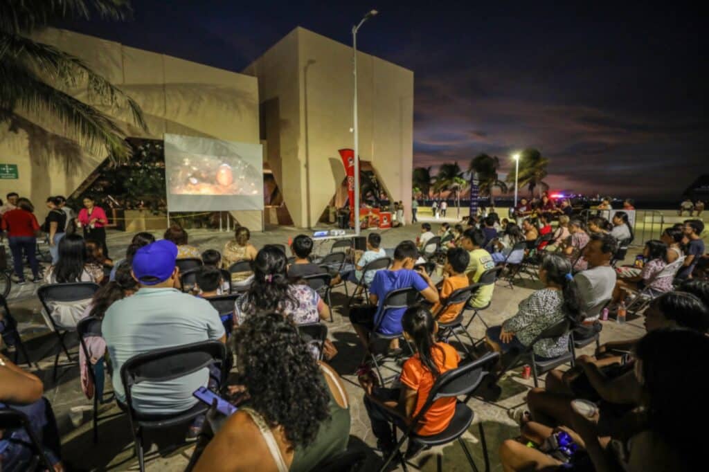 Por la noche, el museo realizó una función de cine al aire libre, con la proyección de una película temática de dinosaurios, en sintonía con la vocación científica del museo.